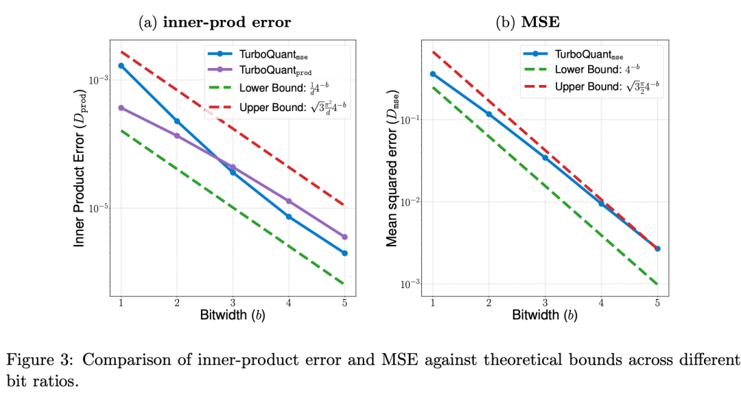 论文给出了严格的理论证明:TurboQuant的MSE失真率,在所有位宽下都控制在理论绝对下限的约2.7倍以内。在1-bit极端压缩的情况下,更是只有最优值的约1.45倍。