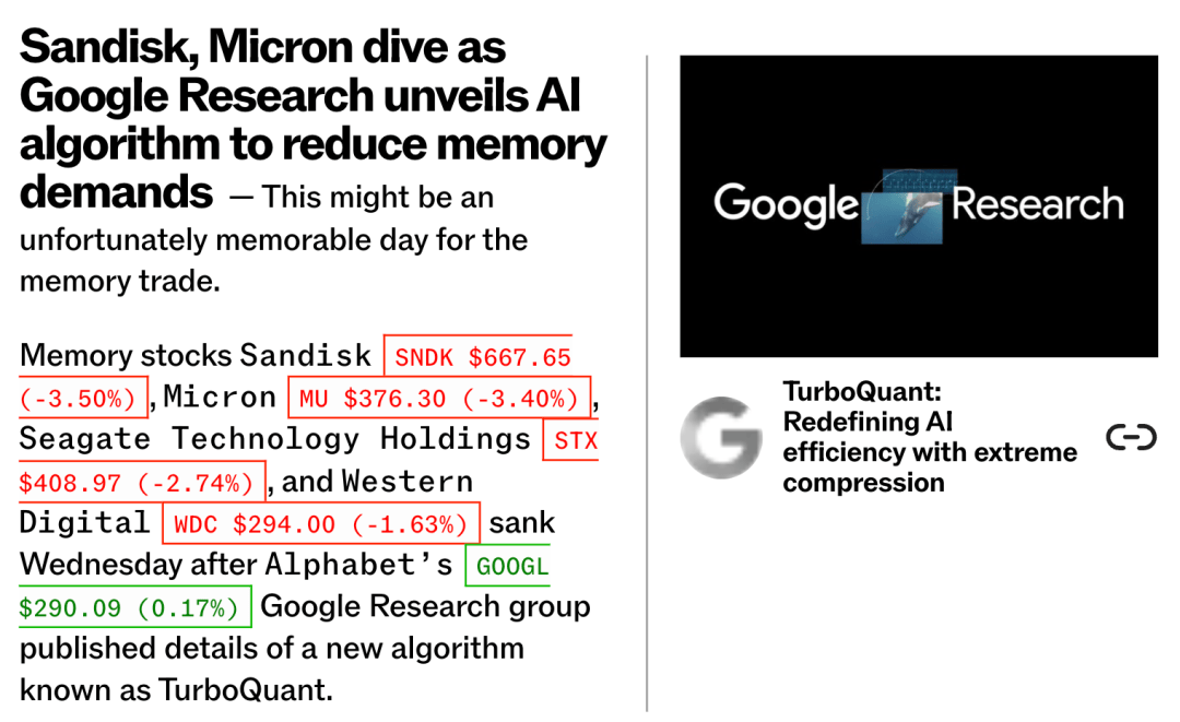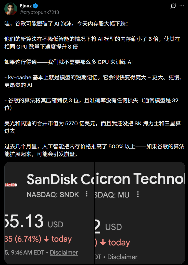 引发这场抛售地震的导火索,正是谷歌发布的TurboQuant压缩算法。
