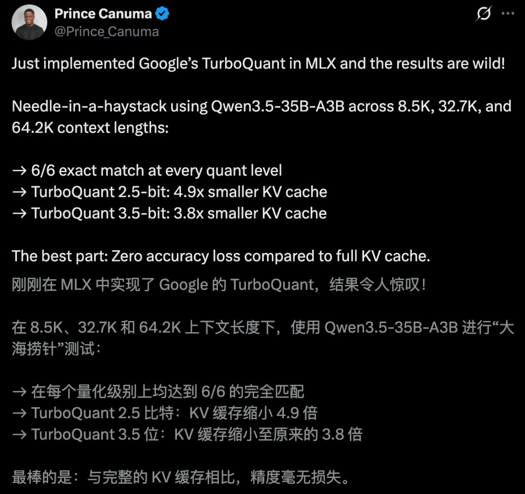 另一位开发者Prince Canuma实测后惊叹道:「面对8.5K到64.2K不等的大跨度上下文,TurboQuant让模型对显存实现极致压缩」。