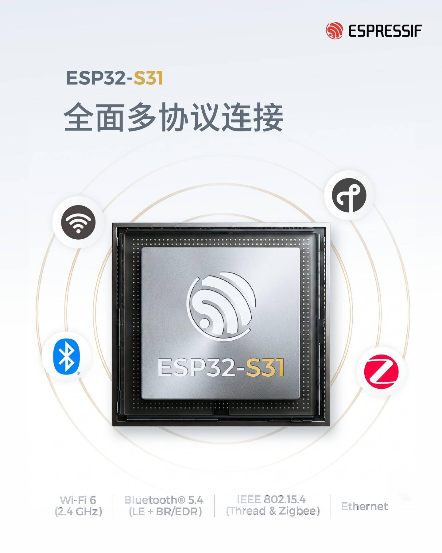ESP32-S31 支持 2.4GHz 频段的 Wi-Fi 6、蓝牙 5.4(含 LE 与传统)、IEEE 802.15.4 (Thread & Zigbee)、千兆以太网 MAC,能满足多样化的 IoT 场景需求;同时其支持基于 Wi-Fi 与 Thread 的 Matter 协议,可实现跨生态设备的无缝连接。