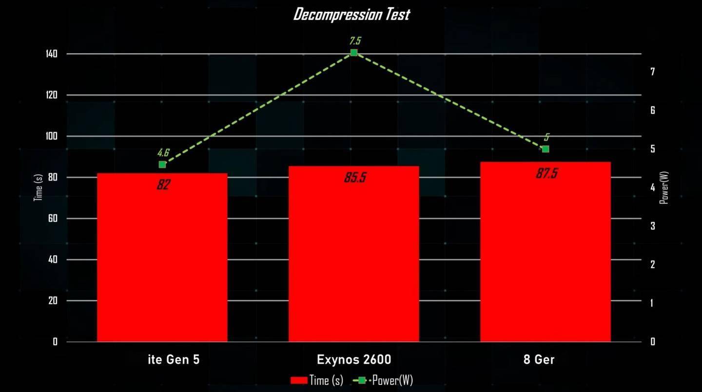 此外该博主还模拟日常场景,在解压 20GB 压缩包任务中,Exynos 2600 的峰值功耗达到 13W,而同台竞技的两款骁龙芯片,功耗均稳稳压制在 5W 以下,三星不仅多耗电 63%,完成任务的时间也更长。