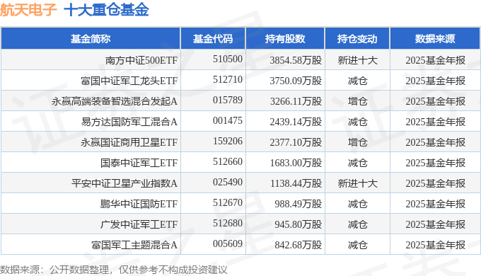 持有航天电子最多的基金为南方中证500ETF,目前规模为446.9亿元,最新净值7.8013(3月27日),较上一交易日上涨1.26%,近一年上涨32.0%。该基金现任基金经理为罗文杰。