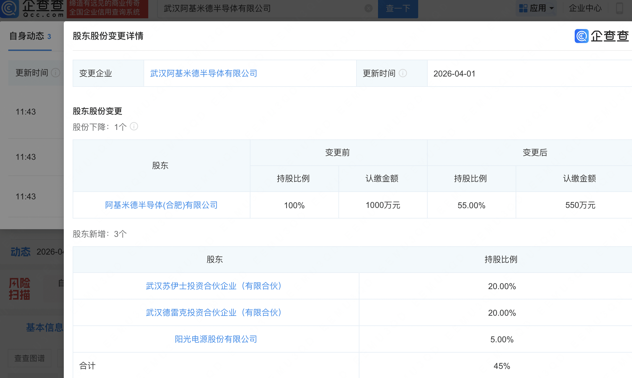 企查查APP显示,近日,武汉阿基米德半导体有限公司发生工商变更,新增阳光电源(300274)等为股东,同时阿基米德半导体(合肥)有限公司持股比例由100%降至55%。企查查信息显示,该公司成立于2026年1月,经营范围包含:集成电路设计;集成电路制造;集成电路芯片设计及服务;半导体分立器件制造;半导体分立器件销售等。