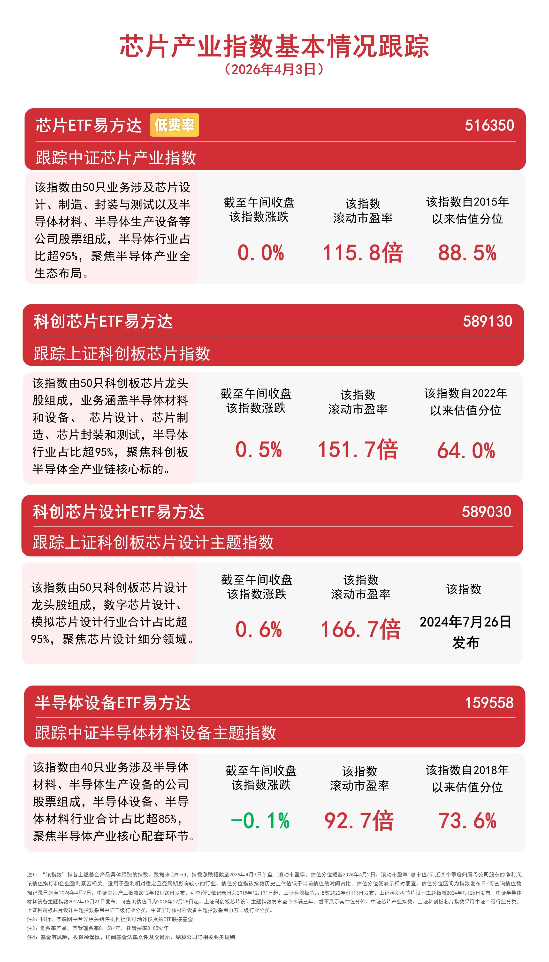 4月3日早盘,A股市场整体调整,光刻机等半导体产业链概念活跃。截至午间收盘,上证科创板芯片设计主题指数上涨0.6%,上证科创板芯片指数上涨0.5%,中证芯片产业指数上涨0.04%,中证半导体材料设备主题指数下跌0.1%,半导体设备ETF易方达(159558,联接基金A/C:021893/021894)半日净申购达800万份。