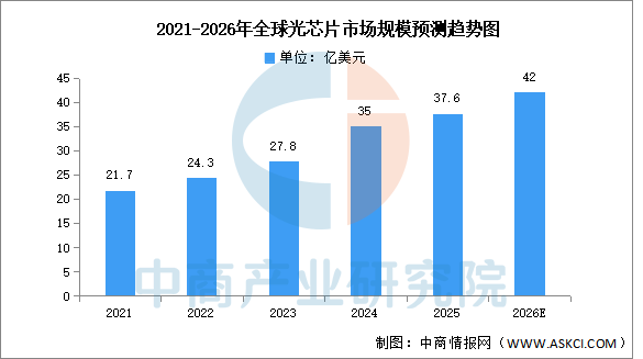 随着云计算、大数据、人工智能等技术的快速发展,光芯片的市场需求也随之增加,推动全球光芯片市场规模持续扩大。中商产业研究院发布的《2025-2030年全球及中国光芯片行业发展趋势与投资格局研究报告》显示,2024年,全球光通信芯片组市场规模约35亿美元,2025年约达37.6亿美元。中商产业研究院分析师预测,2026年全球光芯片市场规模将达到42亿美元。