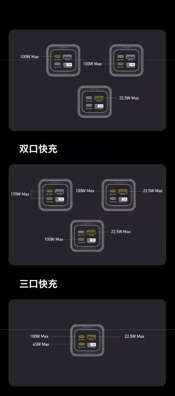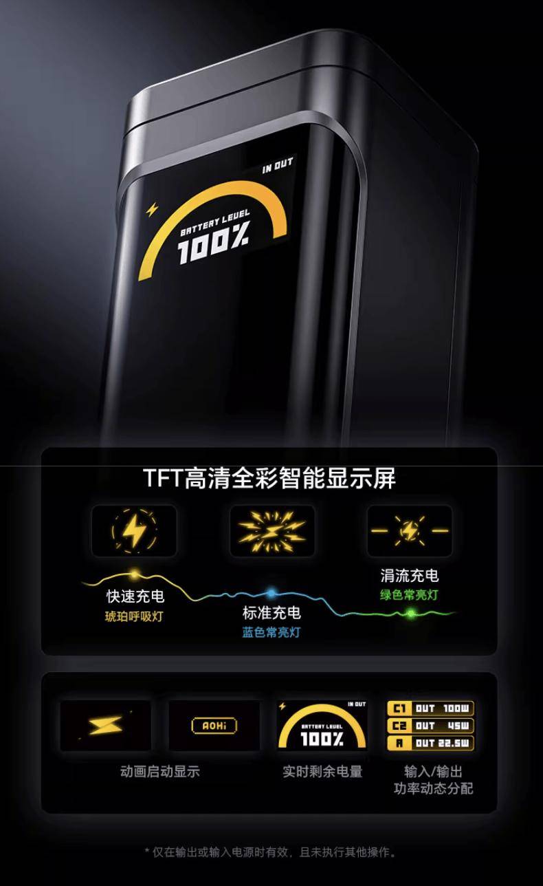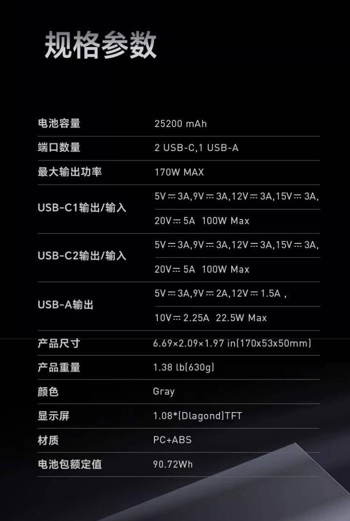 该产品正面配备一块彩屏,支持显示功率温度信息,其 USBC1/C2 接口均支持 100W 输出(支持 PPS 100W/UFCS 63W 输出),USB-A 接口支持 22.5W 输出。其中 USBC1+C2 双口充电时支持至高 170W 输出。