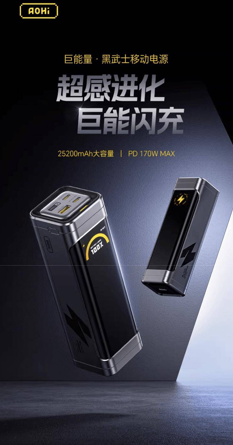 IT之家 4 月 9 日消息,奥海现已在天猫上架 170W 黑武士带屏移动电源,该产品配备 25200mAh 电芯,采用 2C + 1A 设计,支持 PPS 100W 及 UFCS 63W 输出,定价为 299 元。