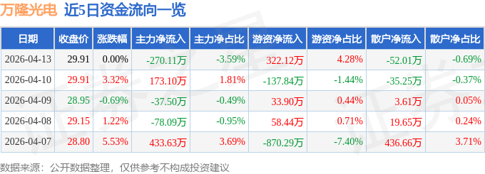 证券之星消息,截至2026年4月13日收盘,万隆光电(300710)报收于29.91元,上涨0.0%,换手率3.4%,成交量2.54万手,成交额7534.47万元。