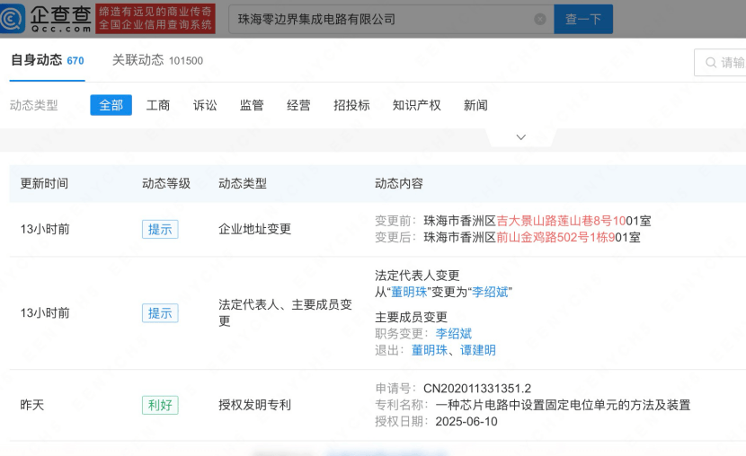 上证报中国证券网讯(记者 李兴彩)企查查显示,珠海零边界集成电路有限公司(简称“零边界”)于6月10日发生多项工商变更,董明珠卸任法定代表人及董事长职务,李绍斌接任法定代表人并出任执行公司事务的董事。