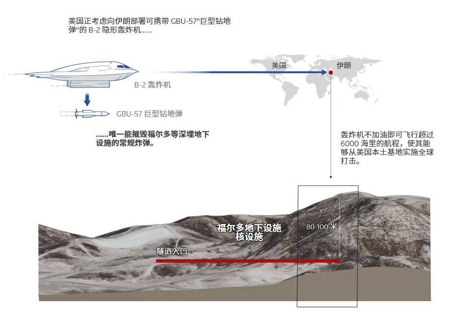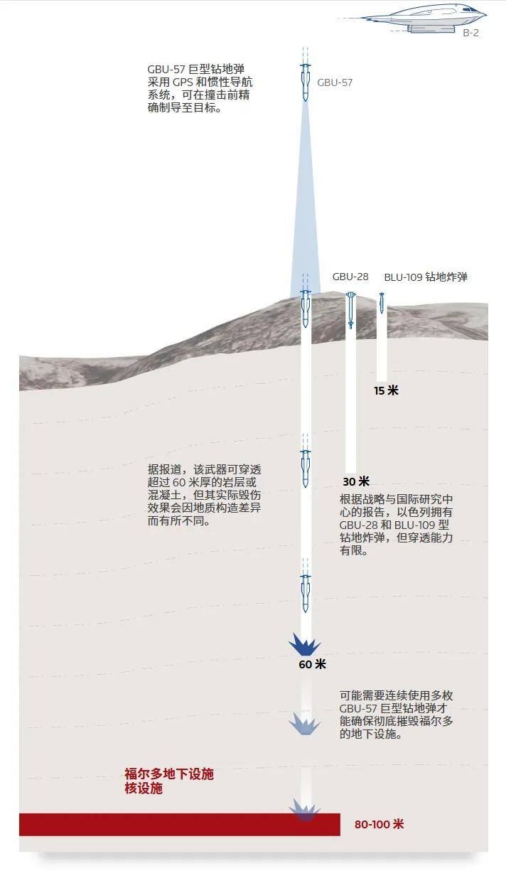 就这个侵彻能力来打福尔多核设施,谁都不能说完全保险。毕竟,一枚航空弹药只能炸开核设施顶部,更不用说GBU-57/B是一种需要临空投掷的航空弹药,其投掷距离从它的气动力学设计上来看,可能最多也就几十千米。