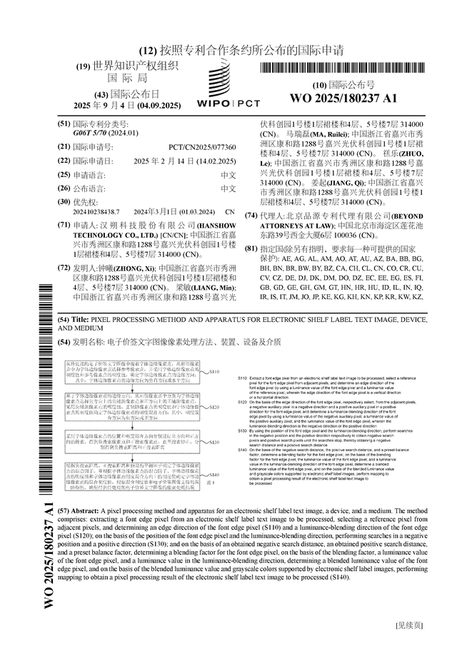 证券之星消息,根据企查查数据显示汉朔科技(301275)公布了一项国际专利申请,专利名为“电子价签文字图像像素处理方法、装置、设备及介质”,专利申请号为PCT/CN2025/077360,国际公布日为2025年9月4日。