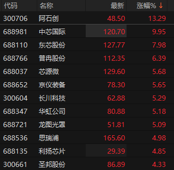 上证报中国证券网讯 9月17日早盘,半导体板块震荡走高,截至9时52分,阿石创涨逾13%,中芯国际涨近10%,股价刷新历史新高,东芯股份涨近8%,芯源微等跟涨。