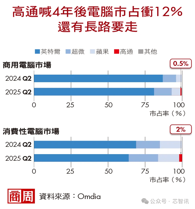 电脑市场长年被英特尔加上微软的“Wintel”组合占据,至今市占率仍高达70%。身为后来者的高通,虽然以有别于英特尔、AMD,采用更低耗能的Arm架构突围。