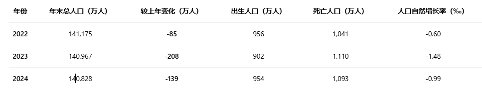 近日,国家统计局发布报告显示,2024年年末,全国人口总量为140828万人。公开数据显示,2022年,中国人口总量近61年来首次出现负增长,由此开始,全国人口总量已连续三年下降,人口减少数量从85万人到208万人不等。