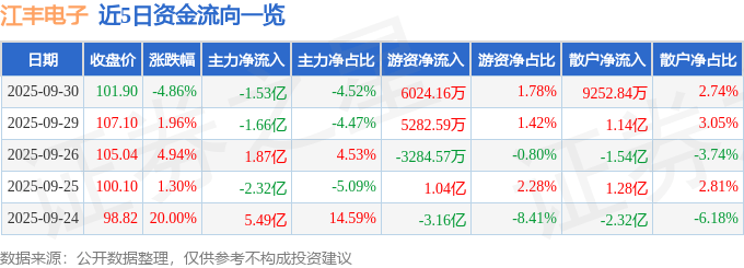 证券之星消息,截至2025年9月30日收盘,江丰电子(300666)报收于101.9元,下跌4.86%,换手率14.71%,成交量32.52万手,成交额33.77亿元。