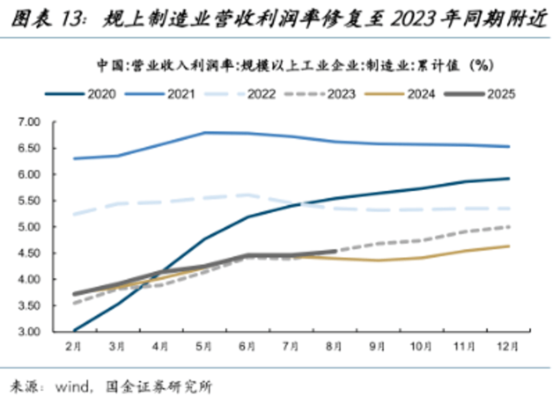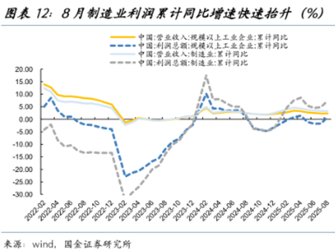国金证券指出,反内卷等政策或引发部分企业利润的扭转。7月各行业反内卷推进后,包括光伏、锂电、煤炭等重点行业价格均呈现了一定上涨,价格的底部正在逐步呈现。相应地,2025年1-8月工业企业利润数据实现由负转正,但代表总量的营收表现仍为平淡。我们认为这是供给侧政策下较为正常的结果,即价格抬升但产量承压,在需求侧没有明显改善的情况下,经济短期内将会走入价格更高,但总产量更低的新状态。