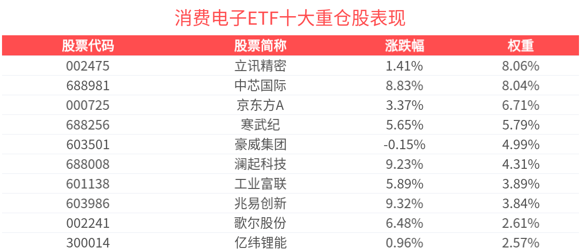 数据显示,截至2025年9月30日,中证消费电子主题指数(931494)前十大权重股分别为立讯精密(002475)、中芯国际(688981)、寒武纪(688256)、工业富联(601138)、澜起科技(688008)、京东方A(000725)、兆易创新(603986)、豪威集团(603501)、亿纬锂能(300014)、华工科技(000988),前十大权重股合计占比55.93%。
