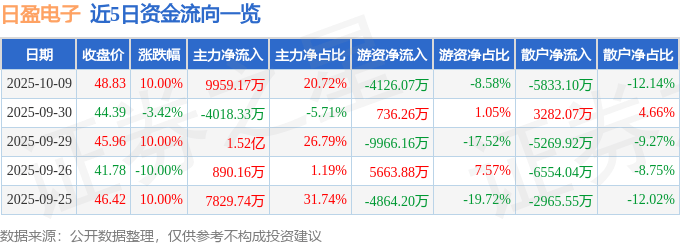证券之星消息,截至2025年10月9日收盘,日盈电子(603286)报收于48.83元,上涨10.0%,涨停,换手率8.82%,成交量10.18万手,成交额4.81亿元。