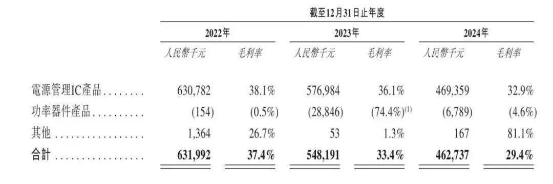 2022年-2024年,芯迈半导体的毛利率分别为37.4%、33.4%及29.4%,逐年下滑。分产品来看,芯迈半导体的电源管理IC产品各期毛利率分别为38.1%、36.1%、32.9%,逐年下滑;功率器件产品各期毛利率则均为负。