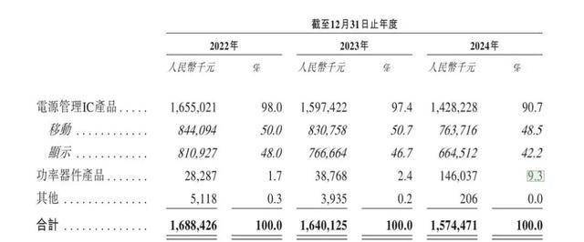 2022年-2024年,芯迈半导体的收入分别为16.88亿元、16.4亿元及15.74亿元,逐年下滑。电源管理IC产品为芯迈半导体核心收入来源,各期业务收入占比分别为98.0%、97.4%及90.7%。