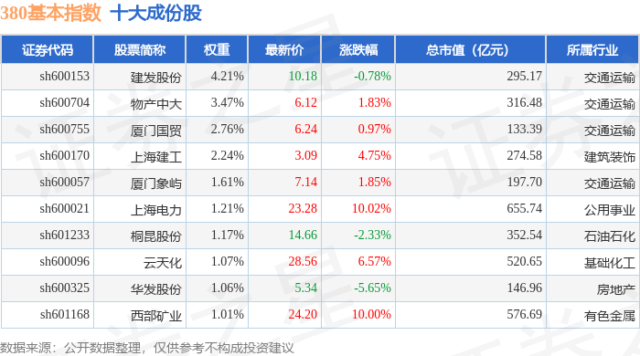 证券之星消息,10月9日,380基本(000128)指数报收于9159.58点,涨1.78%,成交2730.03亿元,换手率2.45%。当日该指数成份股中,上涨的有264家,西部超导以20.0%的涨幅领涨,下跌的有111家,海南华铁以10.02%的跌幅领跌。