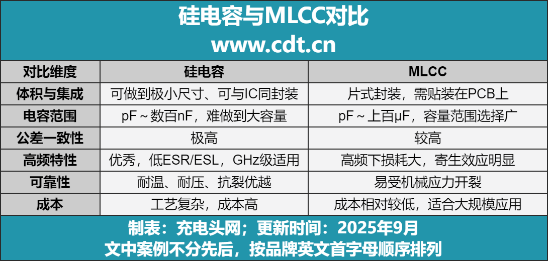 硅电容正是在这一背景下受到广泛关注,其基于半导体工艺制造,具备极低的ESR/ESL和优异的高频特性,可稳定工作在GHz级,同时在体积、厚度和可靠性方面表现突出,并能与IC高度集成。虽然相比MLCC,硅电容的容量范围有限且成本更高,但在高频应用中,其一致性和稳定性优势使其成为不可替代的选择。