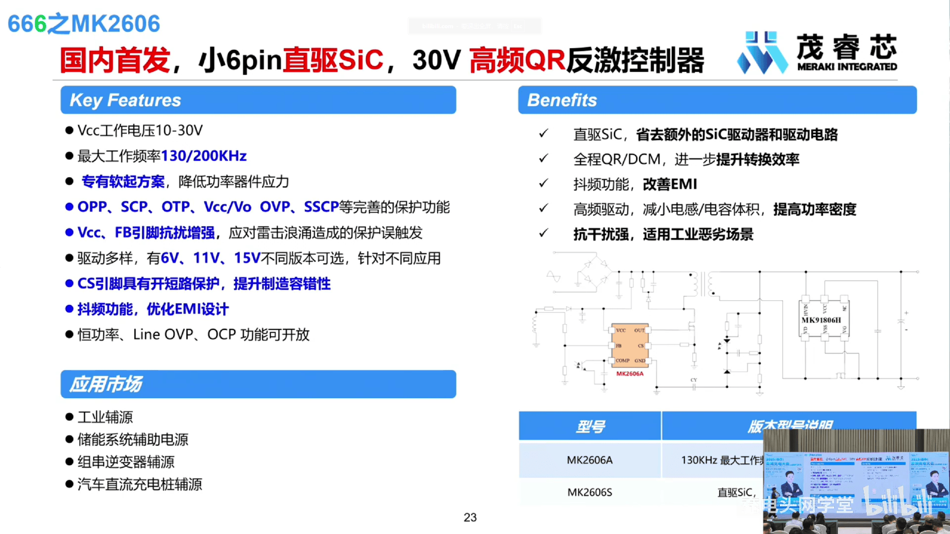 MK2606 还提供过压保护、过流保护、过温保护等保护机制,并针对工业级应用场景设计了增强型抗雷击与浪涌误触发保护;内置抖频功能进一步优化EMI设计;同时采用SOT23‑6这样的小封装,可为便携快充设计节省宝贵的PCB空间,也简化了系统级电路,使得真正意义上的“SiC快充”方案可以在更小、更轻、更高效的产品中落地。