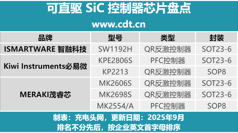 目前国内多家电源芯片厂商已相继推出面向直驱 SiC 的控制器产品线,涵盖 PWM 控制器、QR 反激控制器、PFC 控制器等多种类型,能够支持不同拓扑与功率等级的快充设计。这些器件在驱动能力、保护与上电时序处理上各有侧重,接下来充电头网将详细介绍一下。