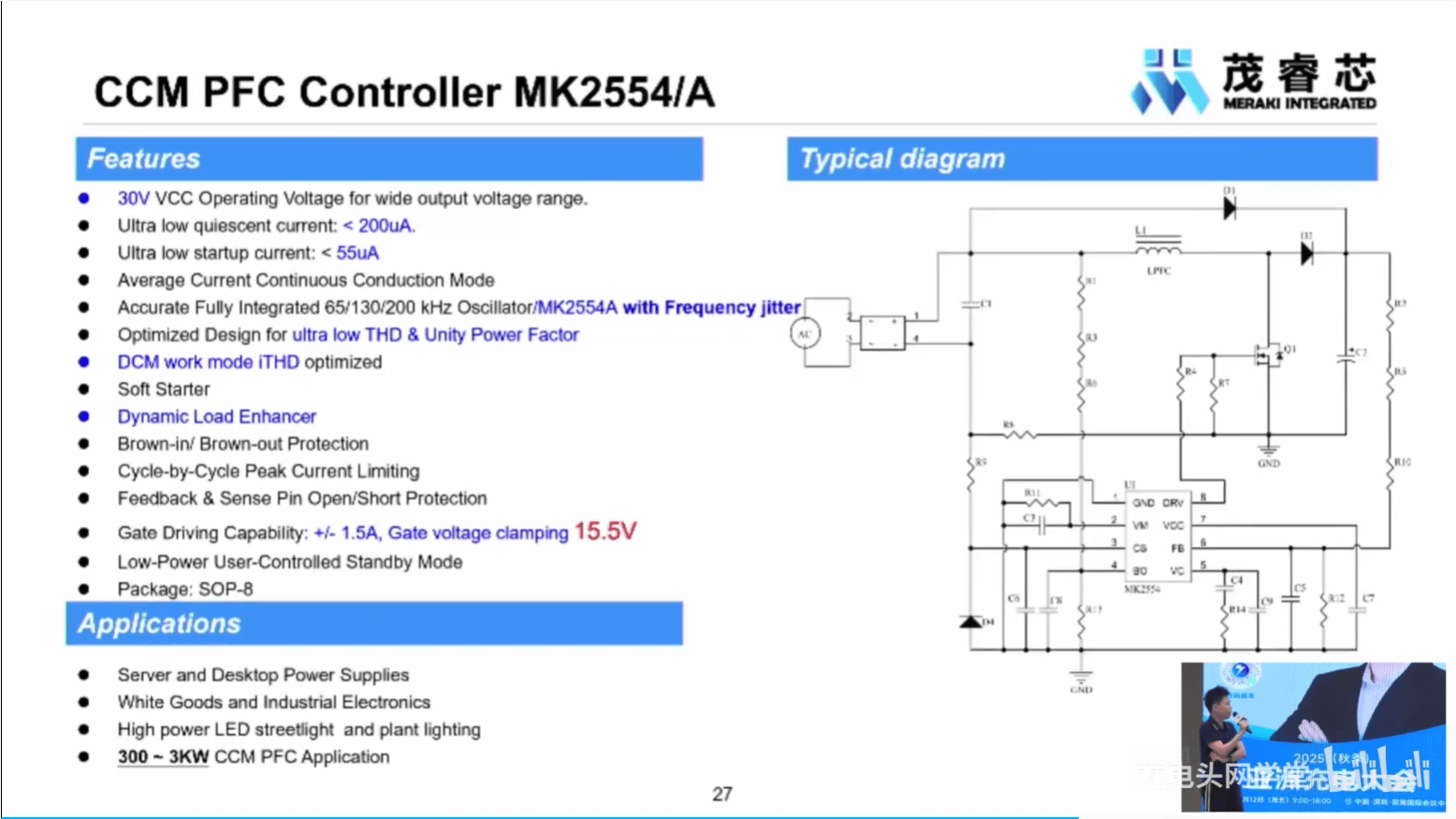 MK2554/A 是茂睿芯推出的连续导电模式(CCM)PFC 控制器,栅极驱动能力达 ±1.5A,栅极驱动钳位在 15.5V,可直接驱动 SiC 功率器件,无需额外驱动电路,有效简化大功率电源架构。
