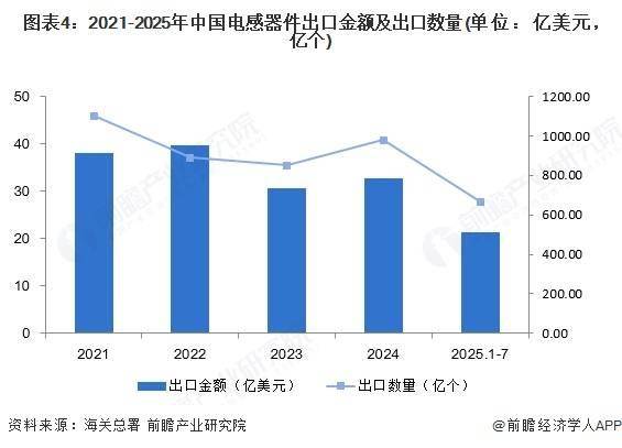 2021-2024年,中国电感器件出口金额和出口数量呈现波动下降趋势,2024年有所回升,2024年中国电感器件出口额为32.72亿美元,同比增长6.6%;出口数量为978.20亿个,同比增长14.9%。 2025年1-7月中国电感器件出口金额约为21.24亿美元,出口数量为666.44亿个。
