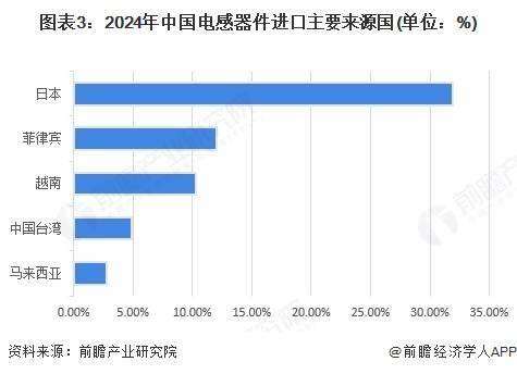 电感器件主要主进口来源国家或地区有日本、菲律宾、越南等等,其中2024年从日本进口电感器件金额较高,为7.60亿美元,占比为31.9%;从菲律宾和越南进口的分别占比为12.07%和10.26%。