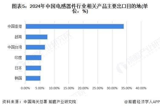 电感器件行业相关产品主要出口目的地为中国香港、越南、中国台湾、印度、日本等,其中2024年出口中国香港的电感器件相关产品金额为11.1亿美元,占当年电感器件出口总金额的34.05%,远超排名第二的越南,出口越南电感器件相关产品的金额为2.52亿美元,占比为7.70%。