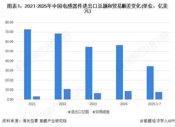 与2023年相比,2024年电感器件进出口总金额有所增长,为56.55亿美元,同比增长3.4%。其中进口金额为23.83亿美元,出口金额32.72亿美元,实现贸易顺差8.9亿美元。2025年1-7月,中国电感器件进出口总金额和贸易顺差分别为34.63亿美元和7.84亿美元。