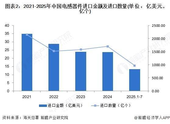2021-2024年中国电感器件进口金额整体呈现下降趋势,2024年中国电感器件进口金额为23.83亿美元,同比下降0.7%。从进口数量来看,2021-2024年电感器件进口数量整体呈现下降趋势,2024年进口数量有所回升,约为1702亿个,同比增长7.7%。2025年1-7月电感器件进口金额为13.39亿美元和972.47亿个。