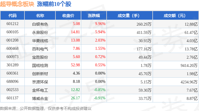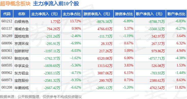 从资金流向上来看,当日超导概念板块主力资金净流出10.9亿元,游资资金净流入6.15亿元,散户资金净流入4.75亿元。超导概念板块个股资金流向见下表: