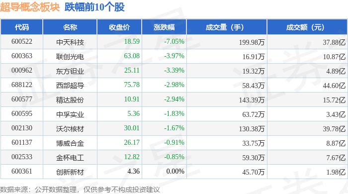 证券之星消息,10月10日超导概念板块较上一交易日下跌1.4%,中天科技领跌。当日上证指数报收于3897.03,下跌0.94%。深证成指报收于13355.42,下跌2.7%。超导概念板块个股涨跌见下表: