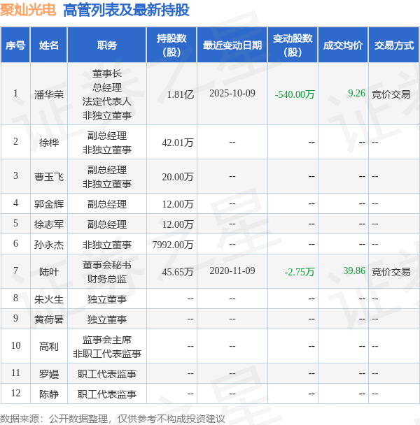 聚灿光电近半年内的董监高及核心技术人员增减持详情如下:
