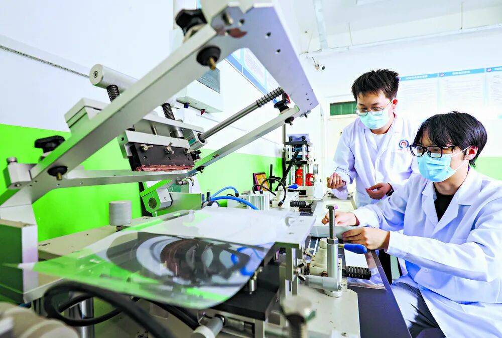 在石家庄铁道大学与河北鼎瓷电子科技有限公司共建实验室内,科研人员利用丝网印刷机对实验样品进行加工处理。