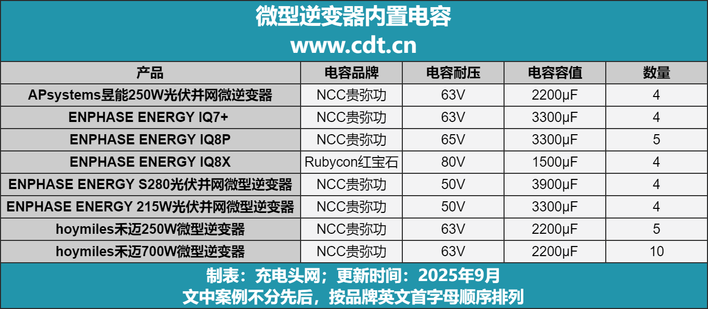 在分布式光伏应用中,微型逆变器因体积小、安装灵活、易于维护的优势,逐渐成为家用及小型光伏系统的主流选择。近年来,充电头网通过拆解分析了多款不同品牌的微型逆变器,发现其中普遍采用了贵弥功和红宝石的高压电容产品,下文我们为您详细介绍。