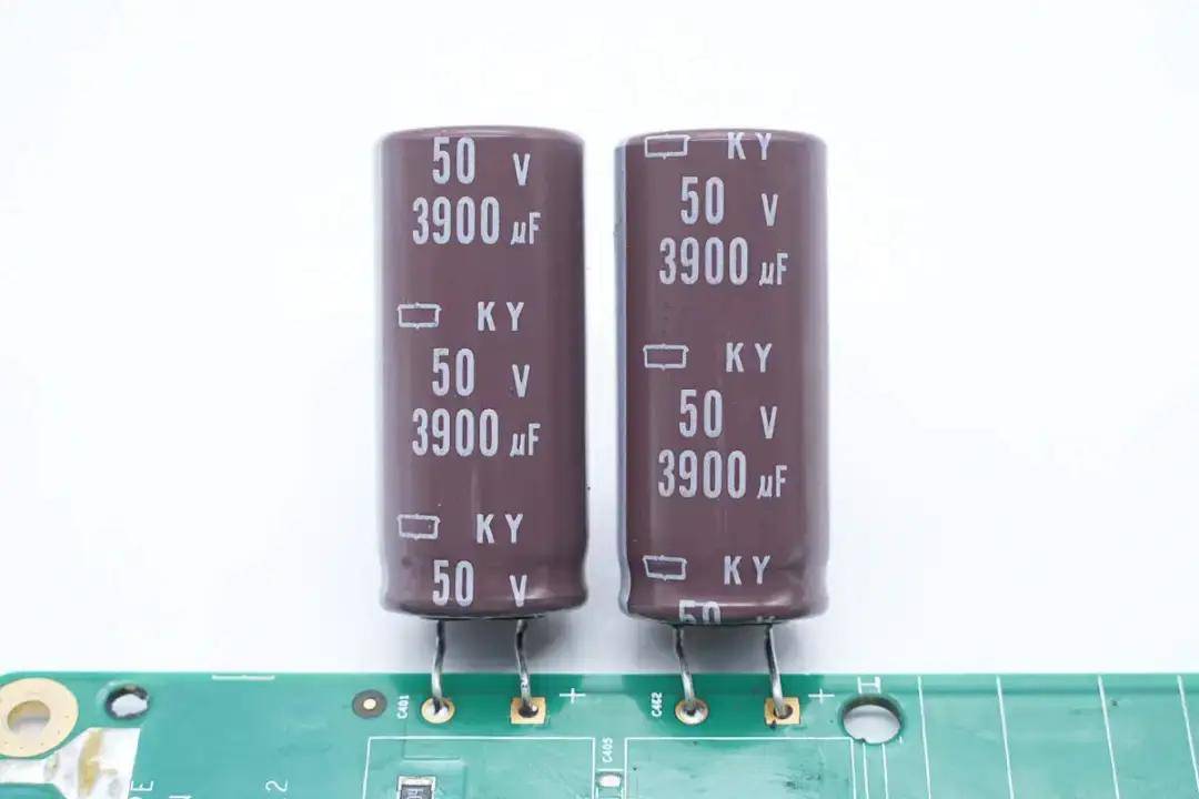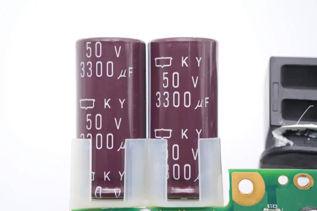 滤波电容来自贵弥功,为KY系列长寿命电解电容,规格为50V 3900μF。