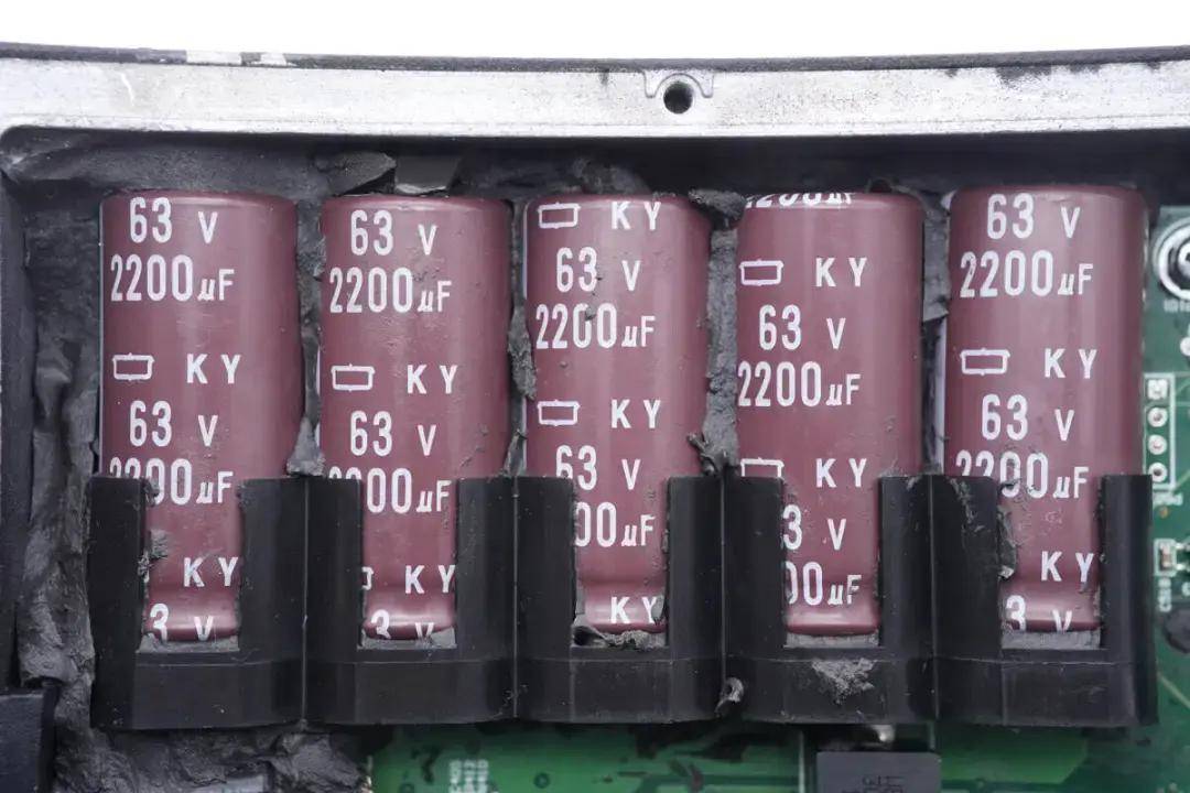 输入滤波电解电容来自贵弥功,KY系列,规格为63V 2200μF,采用塑料支架固定,五颗并联。