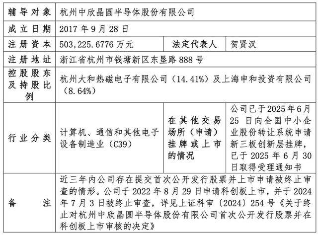 中欣晶圆已于2025年6月25日向全国中小企业股份转让系统申请新三板创新层挂牌,并已于6月30日取得受理通知书。此前,公司曾于2022年8月29日申请科创板上市,并因财务资料过期且逾期未更新,于2024年7月3日被终止审核。