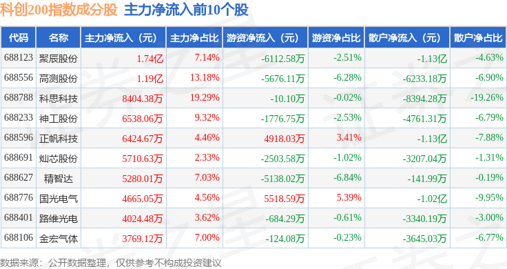 资金流向方面,科创200(000699)指数成份股当日主力资金净流出合计14.1亿元,游资资金净流入合计2.92亿元,散户资金净流入合计11.18亿元。成份股资金流向详情见下表: