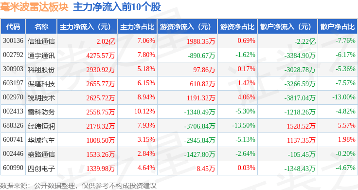 从资金流向上来看,当日毫米波雷达板块主力资金净流出34.92亿元,游资资金净流入5.95亿元,散户资金净流入28.96亿元。毫米波雷达板块个股资金流向见下表: