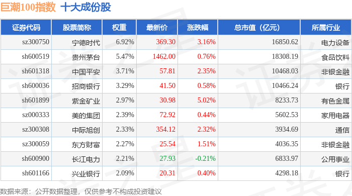 证券之星消息,10月15日,巨潮100(399313)指数报收于5409.35点,涨1.59%,成交2983.84亿元,换手率0.49%。当日该指数成份股中,上涨的有74家,阳光电源以8.31%的涨幅领涨,下跌的有24家,中航沈飞以1.68%的跌幅领跌。