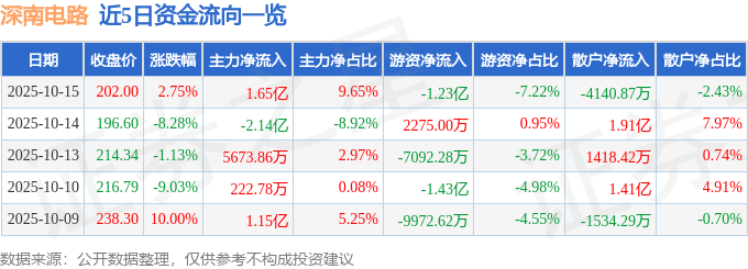 证券之星消息,截至2025年10月15日收盘,深南电路(002916)报收于202.0元,上涨2.75%,换手率1.3%,成交量8.62万手,成交额17.05亿元。