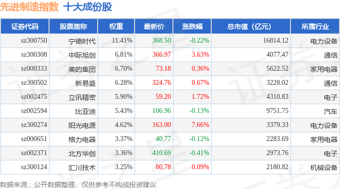 证券之星消息,10月16日,先进制造(399260)指数报收于3645.84点,涨0.79%,成交1802.95亿元,换手率1.85%。当日该指数成份股中,上涨的有18家,阳光电源以7.66%的涨幅领涨,下跌的有32家,领益智造以3.51%的跌幅领跌。