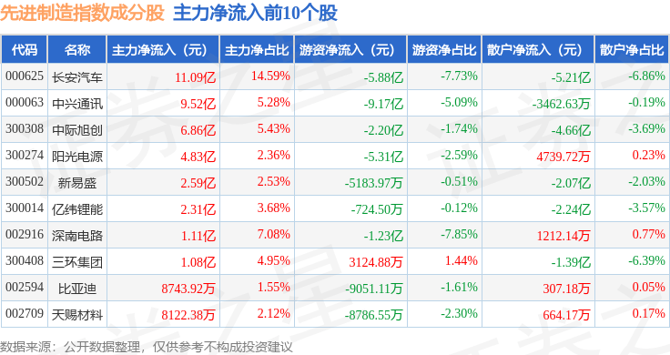 资金流向方面,先进制造(399260)指数成份股当日主力资金净流出合计16.41亿元,游资资金净流出合计7.76亿元,散户资金净流入合计24.17亿元。成份股资金流向详情见下表: