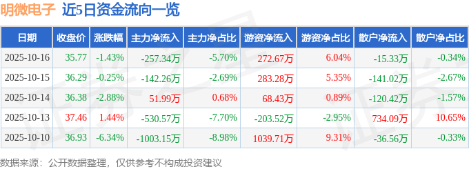 证券之星消息,截至2025年10月16日收盘,明微电子(688699)报收于35.77元,下跌1.43%,换手率1.14%,成交量1.25万手,成交额4517.56万元。