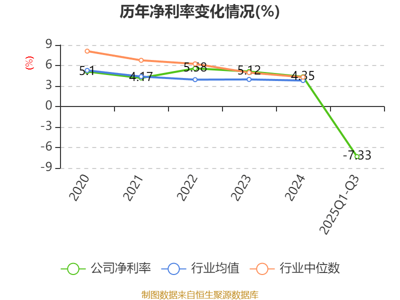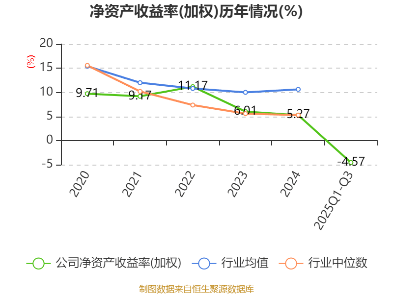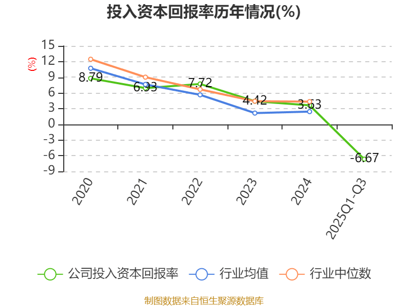 盈利能力方面, 2025年前三季度公司加权平均净资产收益率为-4.57%,同比下降7.53个百分点。公司2025年前三季度投入资本回报率为-6.67%,较上年同期下降8.36个百分点。